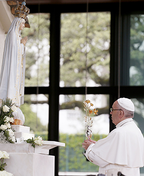 프란치스코 교황이 5월 12일 포르투갈 파티마 대성당 내에 있는 성모발현 경당에서 기도하면서 성모상에 금으로 만든 꽃을 봉헌하고 있다. CNS