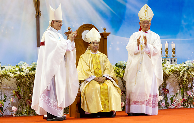 김선태 주교(가운데)가 5월 13일 오후 군산 월명체육관에서 거행된 전주교구장 착좌식에서 전임 교구장 이병호 주교(오른쪽)와 주한 교황대사 오스발도 파딜랴 대주교의 인도로 주교좌에 착좌하고 있다. 사진 박원희 기자