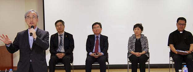주교회의 생태환경위원회가 5월 15일 경주시 대구가톨릭대학교 인성수련원에서 주최한 심포지엄에서 질의응답을 마친 뒤, 위원장 강우일 주교가 총평을 하고 있다.
