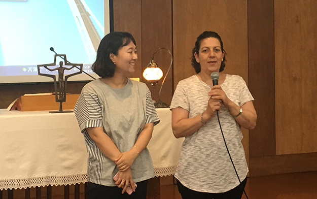 7월 8일 열린 중동 난민을 위한 나눔바자와 콘서트 중 터키 안티오키아에서 시리아 난민학교를 운영하는 박조디 선교사(왼쪽)가 함께 일하는 교사와 함께 현장체험을 나누고 있다.