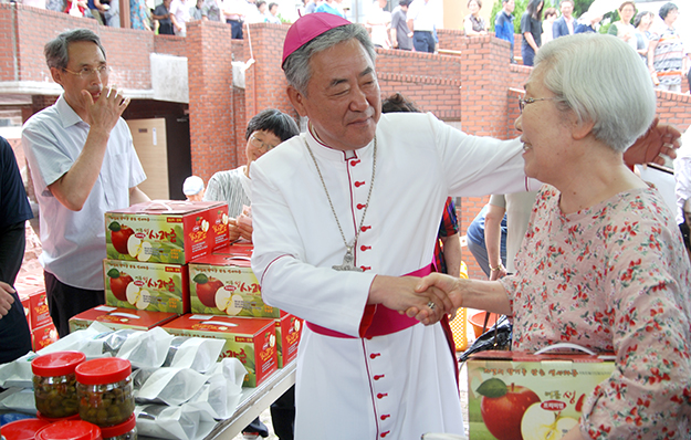 마산교구장 배기현 주교가 16일 마산 양덕동주교좌성당 농산물 직거래 장터에서 신자들과 인사를 나누고 있다.