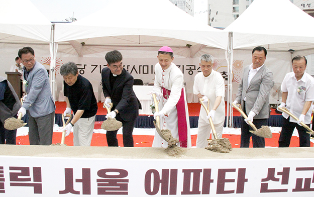 7월 21일 열린 서울가톨릭농아선교회 청각장애인성당 기공식에서 유경촌 주교(가운데, 서울대교구 사회사목담당 교구장 대리)와 박민서 신부(유 주교 왼쪽, 서울가톨릭농아선교회 담당), 김현덕 신부(유 주교 오른쪽, 서울 송파동본당 주임), 정순오 신부(박 신부 왼쪽, 서울 잠실본당 주임)를 비롯한 내빈들이 시삽을 하고 있다. 사진 서상덕 기자