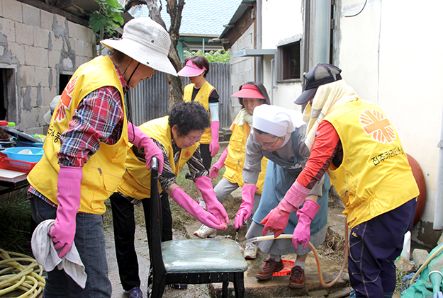 전주교구 가톨릭사회복지회 산하 카리타스봉사단이 7월 19일 충북 보은군 내북면 침수 피해 가옥을 찾아 복구 활동을 벌이고 있다.
