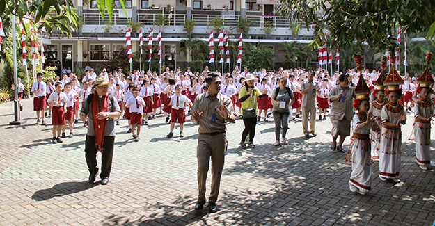 7월 31일 인도네시아 라자왈리 성 요셉 초등학교를 방문한 서울대교구장 염수정 추기경(앞줄 왼쪽)이 환영식에서 전통 춤을 따라 추고 있다. 7월 30일~8월 2일 교구대회에 이어 8월 2~6일 본대회로 진행된 제7차 아시아청년대회는 ‘기뻐하여라, 다양한 문화 안에서 복음을 실천하는 아시아의 젊은이들!’ 주제로 인도네시아 욕야카르타에서 펼쳐졌다. 인천교구 청소년사목국 대학사목부 한덕훈 신부 제공