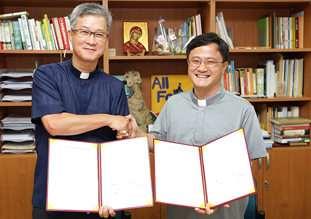 서울대교구 사목국장 조성풍 신부(오른쪽)와 햇살사목센터 소장 조재연 신부가 8월 21일 업무협약 체결 뒤 악수하고 있다.