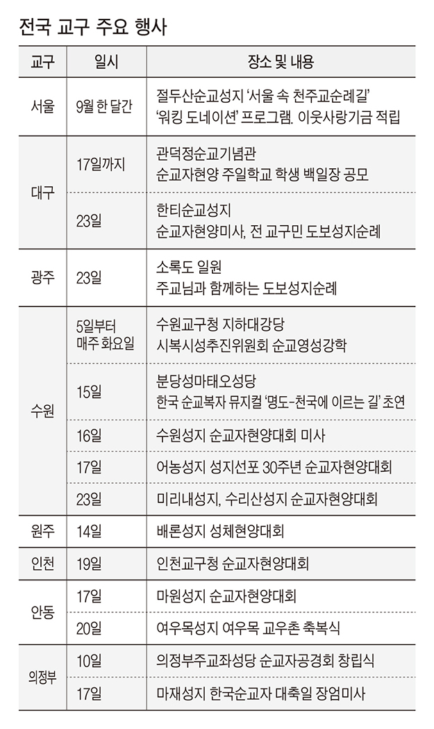 9월 순교자성월을 맞아 전국 각 교구와 성지 등은 순교자현양대회와 기념미사, 도보 순례 등 다채로운 행사를 준비하고 있다.