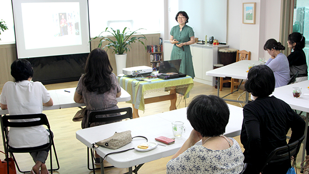8월 14일 대전 마음정원영성센터 ‘영화치료와 영성’ 강의에서 김혜원 대표가 상영 영화에 대해 설명하고 있다.