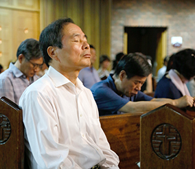 한 신자가 오르간 연주를 들으며 순교자 영성에 대해 묵상하고 있다.