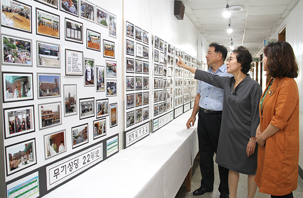 올해를 ‘본당 복음화의 해’로 선포한 부산교구 울산 무거본당 신자들이 9월 9~17일 성당에서 열린 본당 역사 사진전시회의 사진을 보고 있다.