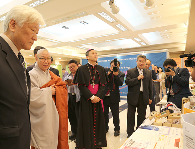 서울대교구 유경촌 주교(왼쪽에서 세 번째) 등 각 종교 지도자들이 9월 14일 열린 사회적기업 육성법 10주년 기념 3대종교 공동행사에서 각 종교 사회적기업이 생산한 물품을 살펴보고 있다.