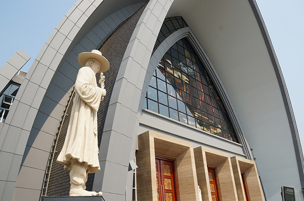 인도네시아 자카르타대교구에 세워진 ‘성 김대건 안드레아성당’. 입구에 성 김대건 신부 상이 보인다. 서울대교구 홍보국 제공