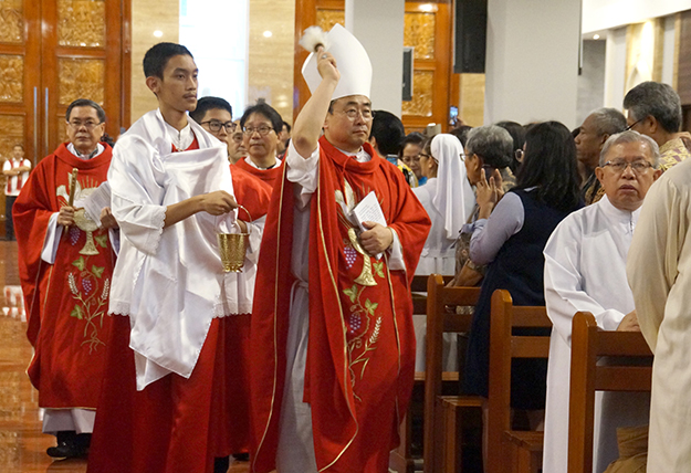9월 20일 오후 5시(현지시간) 인도네시아 자카르타대교구 켈라파 가딩 지역 ‘성 김대건 안드레아성당’ 봉헌식 후 이어진 기념미사에서 서울대교구 총대리 손희송 주교가 성수를 뿌려 신자들을 축복하며 입당하고 있다. 서울대교구 홍보국 제공