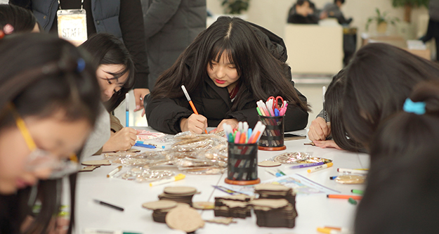 어울마당 사전 행사 중 단원들이 우드아트 부스에서 체험활동을 하고 있다.