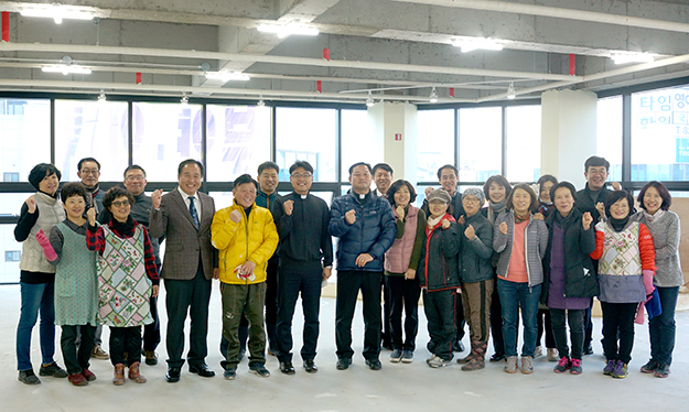 11월 26일 대전 죽동본당 임시 성전에서 죽동본당 주임 김광수 신부(왼쪽에서 아홉번째)와 궁동본당 주임 박요순 신부(김광수 신부 오른쪽), 죽동본당 신자, 궁동본당 회장단이 단체 사진을 찍고 있다. 대전 궁동본당 제공