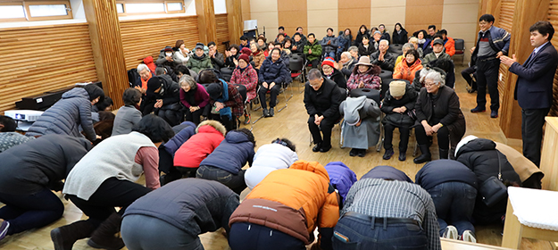 1월 14일 안양 가톨릭복지회관에서 열린 농아선교회 어르신 위안잔치에 앞서 봉헌된 미사에서 신자들이 주님의 기도를 바치고 있다