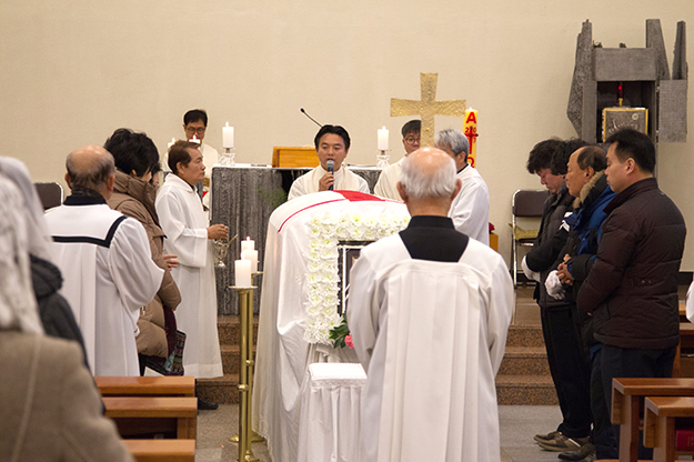 1월 30일 오전 부산교구 남밀양성당에서 밀양 세종병원 화재로 희생된 김 막달레나씨의 조카 김태건 신부가 고별식을 거행하고 있다. 사진 신동헌 기자