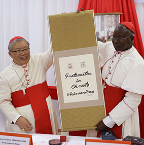 2월 5일 열린 서울대교구와 부르키나파소 와가두구대교구 간 협동선교협약식 뒤 서울대교구장 염수정 추기경(왼쪽)이 라틴어로 ‘그리스도 안의 형제애’라고 적힌 족자를 와가두구대교구장 필리프 우에드라오고 추기경에게 선물하고 있다. 학교법인 가톨릭학원 제공