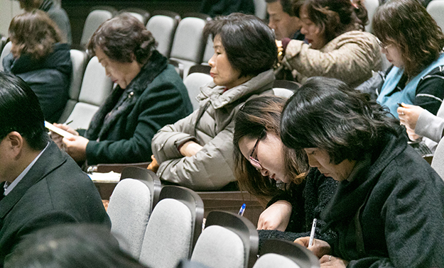 2월 26일 서울대교구 주교좌 명동대성당 꼬스트홀에서 열린 도시피정 참가자들이 피정 중 묵상한 내용을 담은 기도문을 쓰고 있다.
