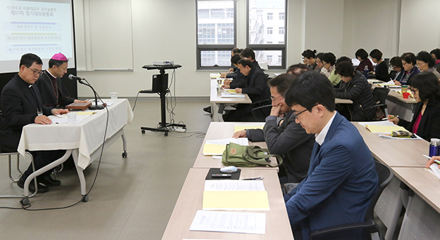 서울대교구 우리농촌살리기운동본부(본부장 백광진 신부, 이하 서울 우리농)는 3월 15일 오전 서울 명동 서울대교구청 강당에서 2018년 제17차 정기 대의원총회를 열고 우리농 활동 활성화 방안을 논의했다. 이날 총회에는 유경촌 주교(서울대교구 사회사목 담당 교구장 대리)와 대의원 등 200여 명이 함께했다.