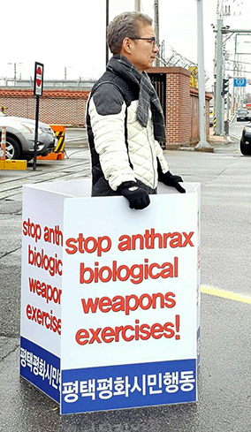 최 신부는 “탄저균은 살상력이 높을 뿐 아니라 포자를 형성해 굉장히 오래 살아남는 위험한 균임에도 미군은 사람들이 살고 있는 도시한복판에서 탄저균 실험을 하고 있다”면서 “3년째 이어온 1인 시위는 우리가 관심을 끄지 않고 있다는 것을 보여주기 위해서”라고 말했다.