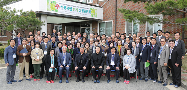 4월 13~14일 안동교구 농은수련원에서 열린 2018년 한국천주교평신도사도직단체협의회 춘계 상임위원회에 참가한 전국 평(단)협 임원들이 기념사진을 찍고 있다.