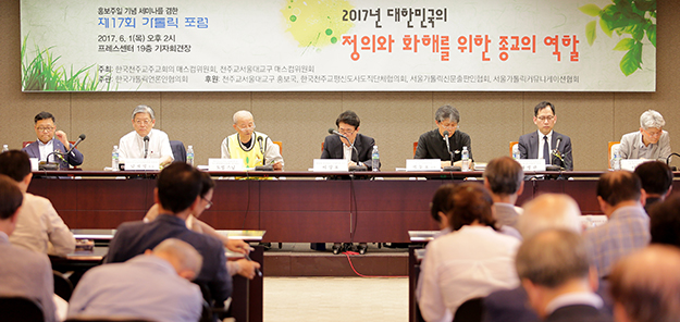 ▲ ▼ 2017년 6월 서울 주교좌명동대성당 파밀리아채플에서 봉헌된 한국가톨릭언론인협의회 창립 50주년 기념미사(위)와 같은 해 6월 한국프레스센터 기자회견장에서 열린 ‘2017년 대한민국의 정의와 화해를 위한 종교의 역할’ 주제 제17회 가톨릭 포럼(아래). 가톨릭신문 자료사진