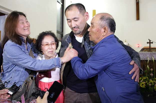 5월 5일 대전교구 신합덕성당에서 잃었던 아들과 딸을 37년 만에 만난 김원제·윤복순씨 부부가 남매와 포옹하고 있다. 맨 왼쪽이 딸 김영숙씨, 오른쪽에서 두번째가 김영훈씨.