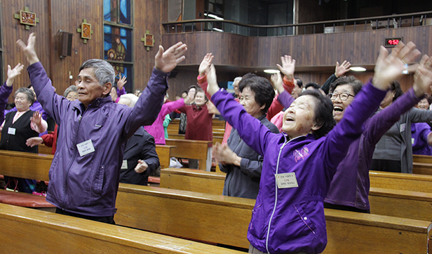 대전 삼성동본당 신자들이 7주간 소공동체 교육 강의 전 레크리에이션에 참여하고 있다.