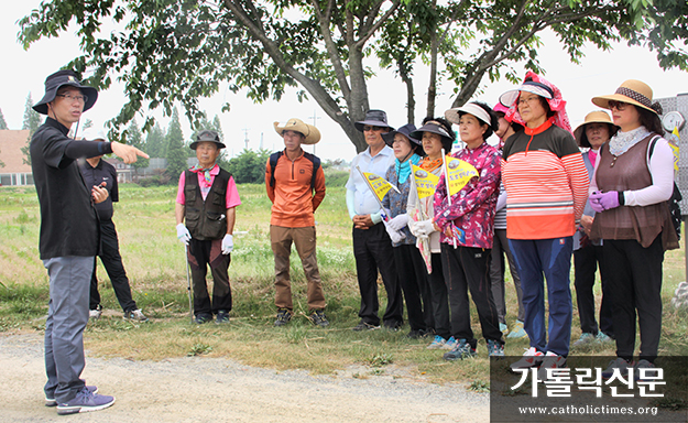 대전교구 합덕본당 주임 김성태 신부(맨 왼쪽)가 6월 9일 열린 ‘목자와 함께 걷는 순례’ 중 합덕제(합덕방죽)에서 참가 신자들에게 장소 의미를 설명하고 있다.