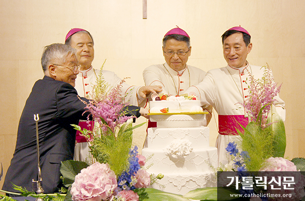 7월 3일 권선동성당에서 봉헌된 수원교구 제1대리구장 취임미사 후 유수일 주교, 이용훈 주교, 이성효 주교, 문희종 주교(왼쪽부터)가 축하케이크를 자르고 있다.