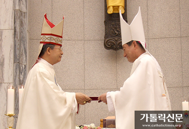 7월 5일 분당성요한성당에서 봉헌된 수원교구 제2대리구장 취임미사 중 교구장 이용훈 주교(왼쪽)가 문희종 주교에게 임명장을 전달하고 있다.