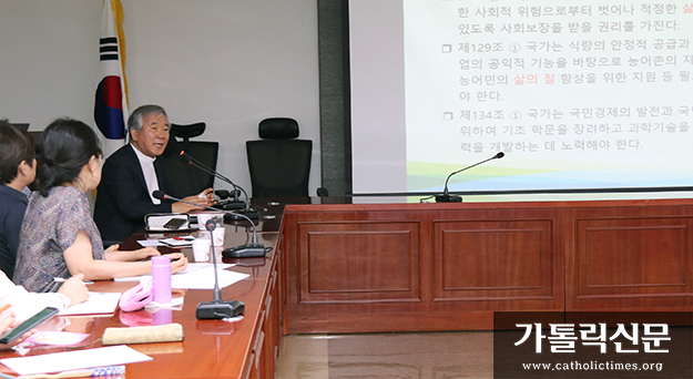 주교회의 생명윤리위원회 총무 이동익 신부(오른쪽)가 7월 21일 서울 영등포구 국회의원회관 1층 제8간담회실에서 ‘제1기 국회 생명학교’ 강의를 하고 있다.