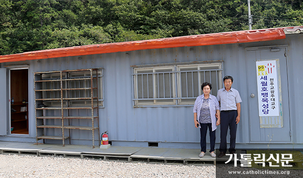 세월호 참사 직후부터 진도 팽목항성당을 지켜온 손인성·김영예씨 부부. 진도군 방침에 따라 팽목항성당은 9월 초 철거 예정이다.
