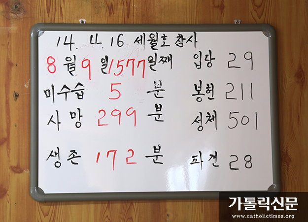 세월호 참사 상황을 기록한 진도 팽목항성당 칠판. 손인성씨가 매일 날짜별로 수정한다.