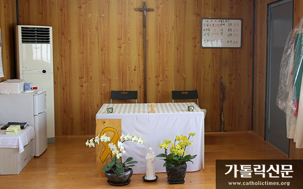 진도 팽목항성당 제대. 제대 꽃은 김영예씨가 수시로 바꾸고 있다.