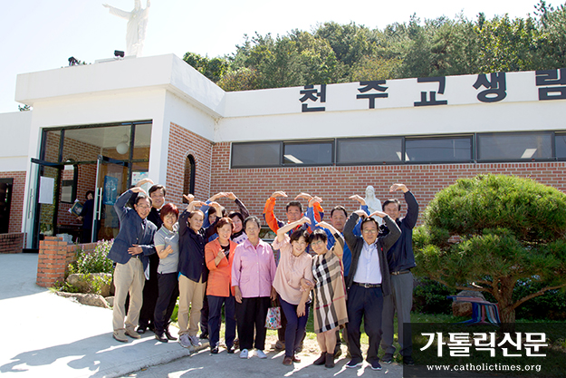 10월 7일 마산교구 생림선교본당 교중미사 후 ‘원천사’ 활동을 했던 신자들이 임성진 신부(뒷줄 맨 왼쪽)와 함께 하트를 만들며 기념사진을 찍고 있다.