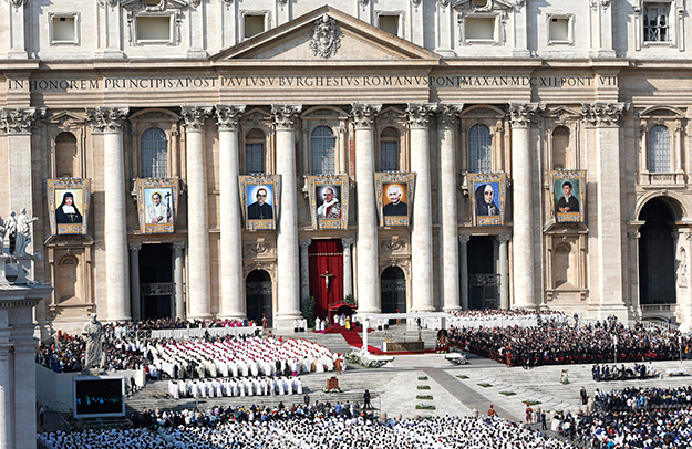 프란치스코 교황이 10월 14일 로마 성 베드로 광장에서 시성식 미사를 주례하고 있다. 이날 바오로 6세 교황과 오스카 로메로 대주교 외에 성체조배수녀회 설립자 프란체스코 스피넬리 신부와 이탈리아의 빈첸초 로마노 신부, 예수 그리스도의 가난한 시녀회 설립자 마리아 카타리나 카스퍼 수녀, 스페인의 교회의 십자군 선교회 설립자 나자리아 이냐시아 수녀, 이탈리아 청년 눈치오 술프리치오가 시성됐다. CNS