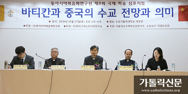 동아시아복음화원구원(원장 김동원 신부)은 10월 27일 수원가톨릭대학교 대강당에서 ‘바티칸과 중국의 수교 전망과 의미’를 주제로 제8회 국제 학술심포지엄을 열었다. 이날 심포지엄에서는 중국 신더셔 사무국장 한칭핑 신부가 ‘중국 주교단의 현황과 사목적 과제’를 주제로 중국 주교단의 역사를, 김동원 신부가 ‘바티칸과 중국의 외교관계 수립 전망과 의의’를 주제로 양국의 수교 가능성과 그 의미를 살펴봤다.