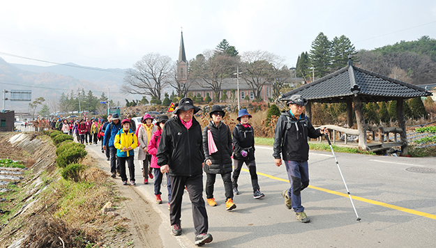 11월 10일 원주교구 평신도 희년 폐막 기념 성지순례에서 교구장 조규만 주교(맨 앞)를 비롯한 평신도들이 용소막성당을 출발해 배론성지로 향하고 있다. 원주교구 홍보부 제공