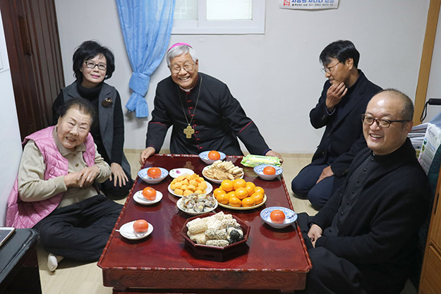 먼저 윤씨 집을 찾은 유 주교는 “아주 작은 선물을 갖고 왔는데, 번거로움만 끼치는 게 아닌지 죄송할 따름”이라며 준비한 물품을 전달하고 윤씨 가정을 위해 기도했다.