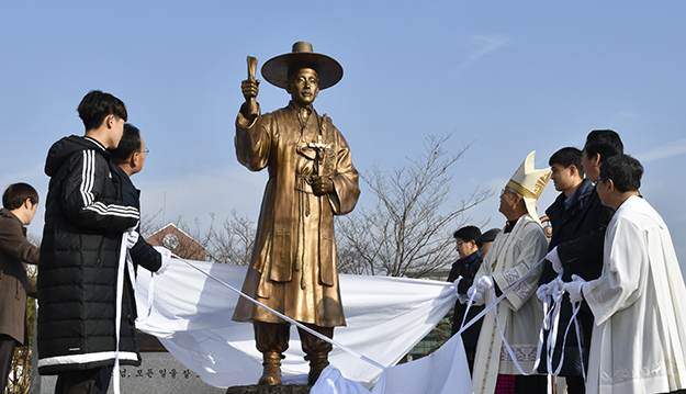 2018년 12월 21일 논산 등화동 논산대건중고등학교에서 열린 성 김대건 신부 동상 축복식 중 유흥식 주교(오른쪽에서 네번째) 및 학교 관계자들이 제막을 하고 있다. 대전교구 홍보국 제공