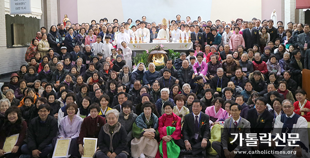 2018년 12월 30일 대전 대화동본당 신자들이 냉담교우 회두 활동 감사미사 봉헌 후 단체사진을 찍고 있다.
