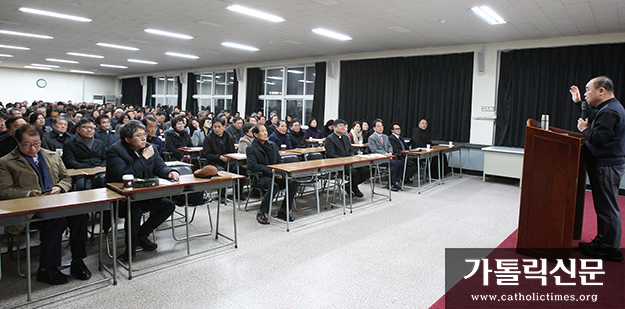 1월 7일 대구대교구청 교육원 대강당에서 열린 대구대교구 평신도위원회 세미나 중 이창수 신부가 선교 방안에 관해 강의하고 있다.