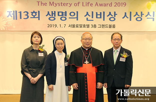 서울대교구장이자 생명위원회 위원장인 염수정 추기경(오른쪽 두 번째)과 제13회 생명의 신비상 수상자들이 1월 7일 서울 중구 명동 로얄호텔 3층 그랜드볼룸에서 기념사진을 찍고 있다. 대상 공영윤 교수(맨 오른쪽), 생명과학분야 장려상 이주현 교수(맨 왼쪽), 활동분야 본상 수상기관인 자오나학교 교장 정수경 수녀(왼쪽 두 번째).