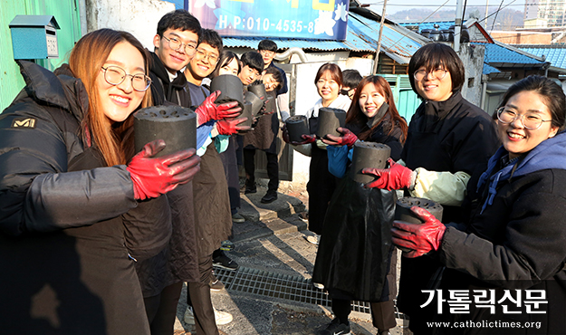 원주교구 청년사목국이 1월 13일 진행한 ‘원주교구 청년과 함께하는 2019 핫데이’ 행사에서 청년들이 소외된 이웃을 위해 연탄을 배달하고 있다.