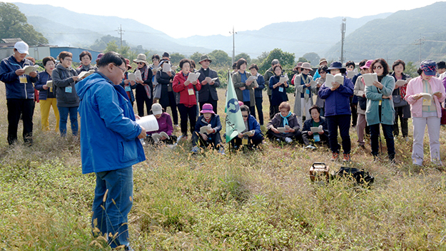 2018년 10월 14일 열린 제27차 순례 중 전남 곡성 옹기점 터에서 양업교회사연구소장 차기진 박사가 순례지를 설명하고 있다. 청주교구 양업순례단 제공
