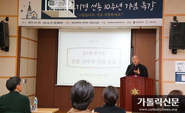 1월 26일 서울 혜화동 동성고등학교 100주년 기념관 소강당에서 열린 ‘김수환 추기경 선종 10주년 기념 특강’에서 구요비 주교가 강의를 하고 있다.