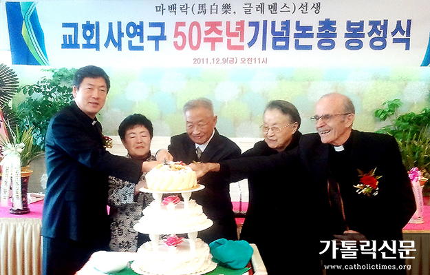 마백락 선생(가운데)의 교회사 연구 50주년을 기념해 2011년 12월 9일 열린 기념논총 봉정식에서 대구대교구장 조환길 대주교(맨 왼쪽), 전 안동교구장 두봉 주교(맨 오른쪽) 등 참석자들이 축하 케이크를 자르고 있다. 가톨릭신문 자료사진
