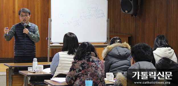 2월 10일 성라자로마을에서 열린 장애아주일학교 교리교안 교육 중 김성남 교수가 발달장애인의 이해와 소통에 관해 강의하고 있다.