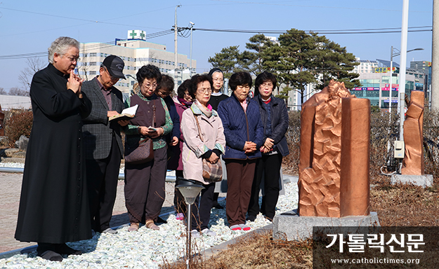 3월 8일 청주 사천동본당 신성근 주임신부와 신자들이 새롭게 조성된 야외 십자가의 길에서 맨발로 기도를 봉헌하고 있다.